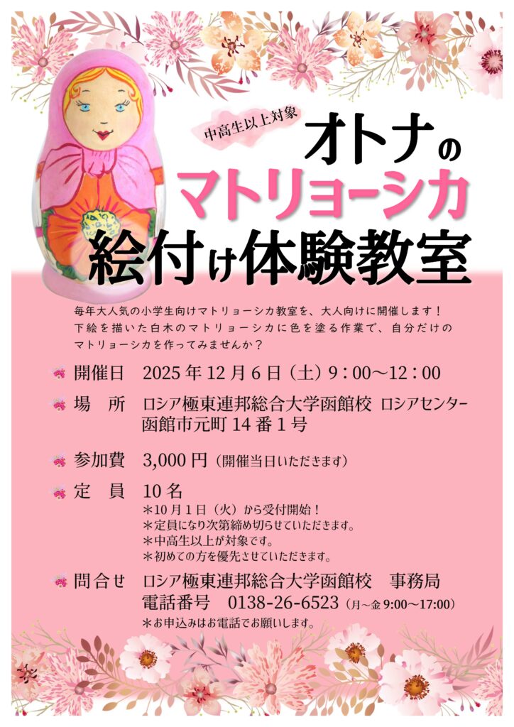 【中高生以上対象】オトナのマトリョーシカ絵付け体験教室のご案内