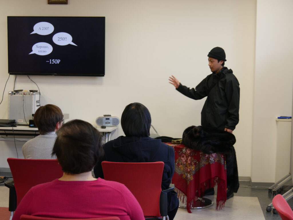 終了後は食堂に場所を移し、表彰式ならびにお茶会となります。教職員が厳正に審査した結果、ウラジオストク留学時に訪れた中国市場での買い物の様子を再現したロシア地域学科2年 櫻井寛人さんが第1位を獲得しました。そのほかの受賞者は以下のとおりです。