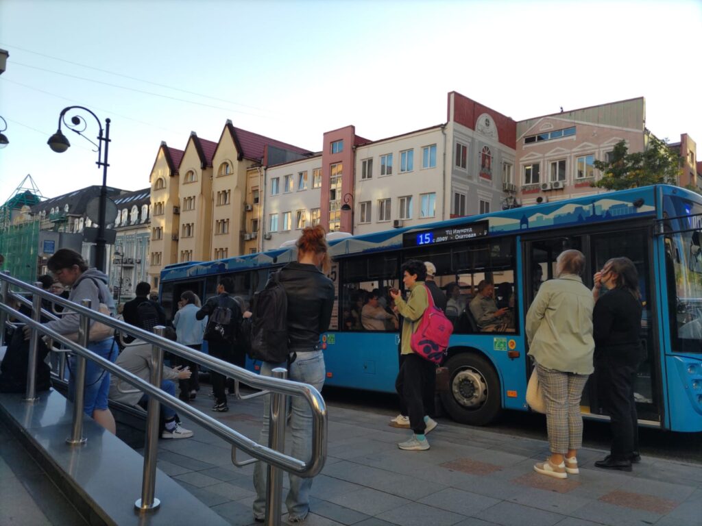 ここは街の銀行の側にあるバス停です。こちらに見えます15番バスは、私たちがよく乗っていたものです。