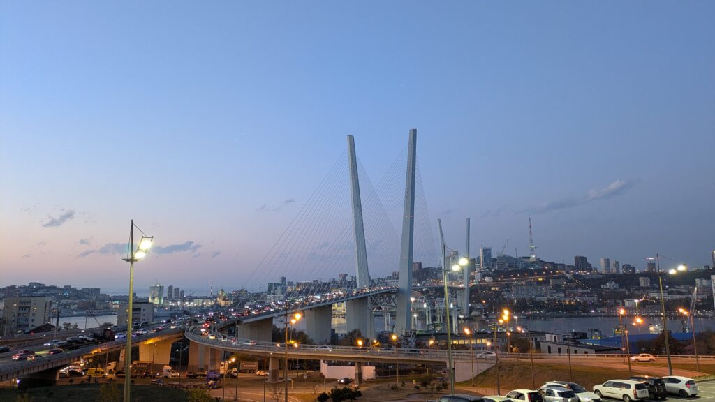 写真では伝わりにくいですが、ウラジオストクの空は完全に日が沈み切る前に淡いサーモンピンク色と水色が混ざり合い、同じく海の街である函館の晴れた日の夕方を思い出させるような眺めでした。